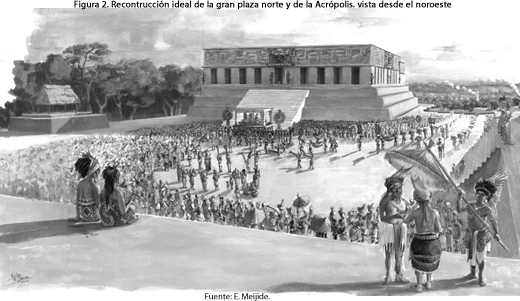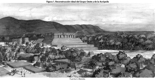 A estos templos en la actualidad los denominamos 10L1 y 10L2, siendo este último el que se conserva en mejor estado. Una escalinata de casi seis metros de anchura y 18 peldaños se eleva sobre los dos cuerpos de la base piramidal hasta la plataforma donde se asienta el templo superior. Sobre esa plataforma aún se conservan los restos de los gruesos muros que conformaban un templo de algo más de nueve metros de fachada, con una estancia interior de unos 12 metros cuadrados y con un único vano central de entrada. Su coronación debió elevarse unos cinco o seis metros sobre la base superior de la pirámide, y la parte más alta alcanzaba algo más de diez metros sobre el pavimento de la citada Plaza Sur. Junto a estas pirámides, una pequeña acrópolis conforma la esquina sureste del conjunto monumental (ver foto 1). Otro edificio que aún no ha sido investigado, el denominado 9K1, delimita la longitud de esa plaza por el norte, por lo que podemos deducir que se trataba de una plaza cuadrada, de unos 3600 metros cuadrados de superficie. Observando el plano topográfico es posible comprobar que, si se compara la orientación de este conjunto monumental con los que están más al norte, hay una diferencia de seis grados sexagesimales, es decir, que su desviación desde el norte geográfico hacia el oeste es la mitad de la que tiene en la zona de ocupación más tardía 12ºNE, lo que parece corroborar nuestra hipótesis inicial de la existencia en este sector de una primitiva ocupación. Desde el ángulo noroccidental de la Plaza Sur partía la Gran Calzada, de 35 metros de amplitud, que recorría unos 250 metros hacia el norte. Sin lugar a dudas fue éste el espacio urbano destinado a desfiles y procesiones que unía la parte más antigua del asentamiento, lugar de veneración de sus ancestros, con el centro del poder político de la nueva urbe, estructurado en torno a la Acrópolis y la Gran Plaza Norte, un nuevo centro de poder surgido en el Clásico Tardío con una función mucho más administrativa que ceremonial o religiosa en vista de las tipologías arquitectónicas que predominarán en este período. Al oriente de la Calzada, entre el Grupo Sur y la Acrópolis, se encuentra una espectacular aguada, hoy desecada, que debió ocupar una superficie de unos 3000 metros cuadrados, y en la que se reflejaría la imagen de la arquitectura que coronaba la Acrópolis. En su época de apogeo, este depósito pudo llegar a conservar unos 5000 metros cúbicos de agua que, sin duda, constituía la reserva del preciado líquido en época de secas para uso de los habitantes de La Blanca. Es posible que este espacio rehundido se haya generado tras extraer la piedra utilizada para la construcción de las nuevas edificaciones del Clásico Tardío. Muy diferente es el espacio urbano que se extiende al occidente de la Calzada Grupo Oeste, organizado en torno a un conjunto de plazas de gran amplitud, bordeadas por plataformas de mediana altura, sobre las que se construyeron edificios fabricados con materiales perecederos, de ahí que actualmente no se conserve ningún vestigio de estas arquitecturas. Indudablemente era en esta área residencial donde vivía la población y donde realizaba sus actividades artesanales. Los campos destinados al cultivo y a la ganadería también se encontraban en este sector (ver figura 1). La sucesión de plazas del Grupo Oeste asciende en paralelo a la Calzada, siguiendo el eje más occidental, aunque con un ritmo más pausado aún que la suave pendiente que posee aquélla y que le permite elevarse unos nueve metros desde su salida de la Plaza Sur hasta el nivel de la Gran Plaza Norte en donde desemboca, es decir, con una pendiente inferior al 4%. Esta plaza está bordeada por el norte y poniente por dos grandes edificios que al unirse cierran la esquina noroeste de la misma. Sin embargo, hacia el oriente el espacio urbano está mucho más abierto, con una sola pequeña edificación en el centro de ese flanco. Las construcciones situadas a poniente son de carácter palaciego y de buena factura, y su trasera es un muro de sillería ciego que delimita el acceso paralelo a la plaza. El edificio del norte presenta una mayor altura y en la actualidad alcanza los diez metros sobre el nivel de la plaza; es muy posible que haya tenido alguna construcción perecedera sobre su cima ya que en ésta no se han hallado vestigios arquitectónicos. Esta enorme plaza, que tiene como escenario principal la imponente fachada norte de la Acrópolis, fue sin duda el lugar para las grandes celebraciones. Con una superficie de más de 5000 metros cuadrados, se calcula que podría haber dado cabida a unas 20 000 personas (ver figura 2). La Acrópolis fue el centro del poder político y lugar de residencia de la élite. Desde la Gran Plaza Norte se accedía a ella a través de una majestuosa escalinata de 12 metros de anchura construida en la fachada norte del basamento. La escalinata avanza unos 14 metros dentro de la plaza y conserva aún sus primeros peldaños de 0,4 metros de altura perfectamente estucados (ver foto 2). El enorme basamento de la Acrópolis está compuesto por cuerpos aterrazados cuyo interior encierra edificios subestructuras de una época anterior. Este basamento está coronado por un palacio de grandes dimensiones en forma de C Palacio 6J2, que conforma un patio central de 36 metros de lado, abierto hacia el oriente. Ese flanco está ocupado por otro palacio 6J1 al que hemos denominado Palacio de Oriente (Muñoz, 2007). De forma rectangular, posee unos 28 metros de fachada, dejando en los laterales norte y sur del mismo dos pasos de entrada al patio central. Este edificio abre sus tres puertas hacia ese patio, siendo la central la de mayor tamaño y la que da acceso a lo que debió de ser la sala de audiencias del dirigente de La Blanca, una sala que se eleva dos metros sobre el pavimento del patio mediante una escalinata de acceso y que presenta unas proporciones inusua