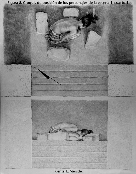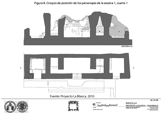 Durante ese convulso período, el panorama de todos estos territorios de las tierras bajas mayas del sur debió ser desolador, con grupos humanos desplazándose de un sitio a otro, tanto los miembros de la élite como las poblaciones campesinas. ¿A dónde emigró la élite dirigente de La Blanca? No lo sabemos pero sí se ha podido documentar una reocupación del sitio en esos años. Estos nuevos habitantes se instalaron en los palacios de la Acrópolis, donde llevaron a cabo actividades domésticas muy alejadas de aquéllas realizadas por sus primitivos ocupantes. La presencia de basureros en el patio de la Acrópolis y el estudio de su contenido son testimonios de que estos nuevos moradores no pertenecían a la élite y de que se instalaron en las dependencias palaciegas sin ocuparse de su adecuado mantenimiento, mientras que el resto de los edificios de La Blanca se quedaron ya para siempre a medio remodelar. La situación política del momento debió ser francamente inquietante, de ahí que se mantuvieron en cierta forma atrincherados en la Acrópolis, como así lo demuestra el hecho de que algunos de sus accesos fueran clausurados (Vidal y Muñoz, 2011). Esta situación no habría de durar mucho tiempo y el definitivo abandono del sitio en tiempos del Clásico Terminal se produjo de forma violenta. El hallazgo de más de una decena de enterramientos sobre superficie en diferentes espacios de este conjunto monumental patio interior, terrazas del lado sur, interior de los cuartos constituye un claro ejemplo de cómo la crisis del Clásico Terminal afectó a estos sitios de la cuenca del río Mopán, ya que estos individuos, en vez de haber sido debidamente inhumados según el ritual maya tradicional, fueron dejados expuestos sobre el nivel del piso, y algunos de ellos presentaban signos de violencia (Valdés y Vidal, 2007: 177-179) (ver figura 4). A partir de entonces, los edificios abandonados fueron víctimas de las agresiones medioambientales y del paso del tiempo, de modo que acabaron parcialmente colapsados sobre espesas capas de derrumbe. Y así los encontraron unos 100 años más tarde grupos humanos del período Postclásico Temprano (1000-1200 d.C.) que, de forma esporádica, se instalaron en estas dependencias parcialmente destruidas. En ellas dejaron a modo de ofrenda grandes ollas depositadas boca abajo y otros restos de cultura material, e incluso algunos encontraron sobre el escombro su lugar de descanso eterno, pues el estudio de los enterramientos hallados en esos niveles ha demostrado que pertenecen a ese período. Tras esas esporádicas ocupaciones de época postclásica, La Blanca permaneció parcialmente sepultada por la espesa vegetación, si bien existe constancia de la presencia de exploradores y otros curiosos que, al menos desde el siglo XVIII, comenzaron a visitar el sitio y dejaron su firma en los muros de los palacios semidestruidos; por ello, estos grafitos de época moderna se encuentran a la altura del arranque de las bóvedas de estos edificios, únicas partes visibles de los mismos (Muñoz, Vidal y Haeussler, 2009). Más adelante, a comienzos del siglo XX, el investigador estadounidense Raymond E. Merwin hizo interesantes fotografías de las arquitecturas visibles del sitio, las cuales fueron de gran ayuda para la formulación del Proyecto La Blanca.