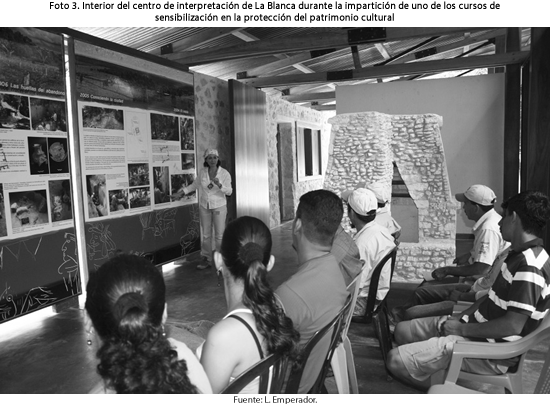 El Proyecto arqueológico La Blanca surgió como una propuesta conjunta de la Universidad de Valencia y de la Universidad Politécnica de Valencia, apoyadas por la Universidad de San Carlos de Guatemala, y fue financiado por el Ministerio de Cultura de España dentro de su Programa de Excavaciones en el Exterior. El objetivo principal era la investigación y puesta en valor del asentamiento urbano de La Blanca, que había sido identificado, como decíamos, desde inicios del siglo XX, pero en el que nunca se había realizado una profunda investigación arqueológica y arquitectónica. Otro de los objetivos de este proyecto era la puesta en marcha de diferentes actuaciones conducentes al desarrollo social y económico de las comunidades del entorno del sitio arqueológico, especialmente de la aldea de igual nombre localizada a menos de dos kilómetros de distancia, con el convencimiento de que actualmente ya no se puede hablar aisladamente de patrimonio cultural o de investigación científica sin que todo esto conlleve un compromiso ético y social con las poblaciones en donde están enclavados estos bienes culturales. La aldea La Blanca tenía una población cercana a los 1000 habitantes en 2004 (Monterde, 2004: 164) y se creó en el proceso de colonización que el Gobierno de Guatemala llevó a cabo hace unos 50 años, mediante el traslado de familias de otros departamentos y la adjudicación de tierras en esta zona de Petén. La población actual de La Blanca se dedica principalmente a la agricultura y a la ganadería, y su asentamiento carece de algunas infraestructuras básicas tales como sistema de evacuación de aguas y electricidad. Posee un sistema propio de distribución primaria de agua desde unos depósitos que se abastecen de dos manantiales subterráneos naturales. Las viviendas son en general autoconstruidas y de carácter popular, edificadas a partir de los materiales disponibles, normalmente madera o bajareque, con cubiertas vegetales, aunque también hay algunas realizadas con fábricas más sólidas, edificadas con bloques de cemento y cubiertas de lámina metálica. Como decíamos, el Proyecto La Blanca se concibió desde un principio como un proyecto de patrimonio cultural con una clara visión de desarrollo de las poblaciones vinculadas. En este sentido, desde un principio se realizó un estudio de caracterización social, económica y cultural de la población de La Blanca para programar una serie de acciones de concienciación y formación que posibilitaran que la actuación de investigación científica, recuperación, restauración y puesta en valor del sitio arqueológico constituyeran a la vez un motor de desarrollo social, económico y cultural de los habitantes aledaños. Dichas acciones se desarrollaron de forma ininterrumpida desde el año 2005 hasta el 2012, y la implicación de los habitantes de La Blanca en el proyecto ha sido muy intensa desde sus principios. Cada temporada de campo, entre 25 y 30 personas de la población trabajan y se forman en las técnicas de excavación y conservación, con las que adquieren en algunos casos gran capacidad y destreza. De forma paralela, se ha fomentado el conocimiento del sitio arqueológico y del área maya en general mediante talleres de sensibilización en la protección y conservación del patrimonio cultural (Vidal, Muñoz, Vázquez y Horcajada, 2010), y con el apoyo del Instituto Guatemalteco de Turismo se han ofrecido cursos de capacitación de guías y anfitriones comunitarios en los que los asistentes recibieron formación para recibir a visitantes y explicarles tanto las características y valores culturales del sitio arqueológico, como las costumbres y modos sociales de la población de La Blanca (ver foto 3). La construcción de un centro de interpretación a la entrada del sitio arqueológico (Vidal y Muñoz, 2008; Muñoz, Vidal, Martín y Peiró, 2010), así como el diseño de senderos interpretativos y de paneles informativos en el interior del mismo, han fomentado en gran medida la afluencia de turistas así como la difusión de los trabajos de investigación y puesta en valor de este antiguo asentamiento maya. La puesta en marcha en el año 2012 del taller de teatro "La Blanca a escena", protagonizado por la población infantil de La Blanca, ha contribuido a estrechar los lazos de identidad de este sector de la población, tanto con el pasado maya como con las ruinas arqueológicas, algo fundamental para que las valoren y se sientan portadores y responsables de este rico patrimonio cultural y natural. En definitiva, todas estas acciones han sido diseñadas con la idea de convertirse en un programa de referencia para otros muchos sitios arqueológicos vinculados a pequeñas poblaciones en el área de Petén en los que es factible realizar proyectos de patrimonio cultural y desarrollo sostenible similares, creando así una red territorial destinada a favorecer un turismo cultural alternativo de baja intensidad. Un turismo susceptible de suponer una mejora en las condiciones sociales y económicas de estas poblaciones, poseedoras de un extraordinario patrimonio cultural.
