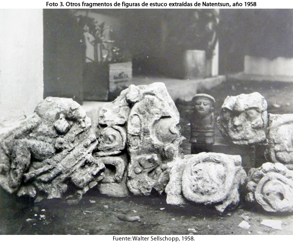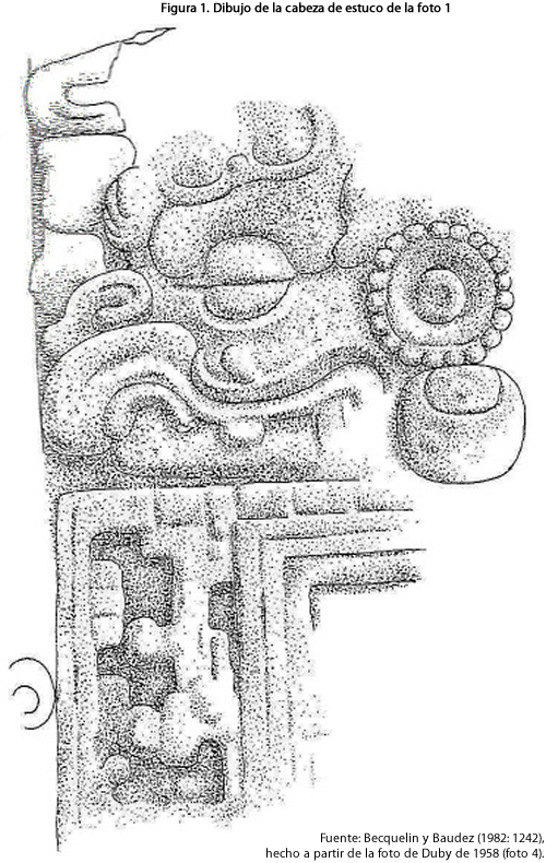 En la figura fijada al muro, Cordan vio una variante de la cabeza del glifo para las unidades de tiempo llamadas k’atun en el sistema calendárico de los antiguos mayas (ver fotos 1 y 4, y figura 1), mientras que en la figura conservada en la casa de Jiménez observó la variante de la cabeza del glifo para las unidades bak’tun (ver foto 2) (Cordan, 1959: 70-113). Blom, quien sólo conoció la figura fijada al muro, señala sin embargo que el presunto glifo de k’atun no presenta numeral alguno, por lo que no podría corresponder al glifo de la unidad señalada; en su lugar, Blom ve un ejemplo del llamado Glifo F, el cual en las inscripciones calendáricas aparece precisamente sin numeral (Blom y Duby, 1959). No obstante, las figuras, por sus rasgos, parecen corresponder, a nuestro parecer, a glifos de k’atun y bak’tun tal como lo propuso Cordan; los numerales, posiblemente elaborados también en su variante de cabeza, pudieron haberse destruido durante el saqueo. El glifo del bak’tun3 puede identificarse por el gran ojo y la mano puesta en la mandíbula del ser; por el contrario, el glifo del k’atun se puede reconocer por su ojo pequeño. Otros de los fragmentos de estuco muestran figuras antropomorfas, cráneos, posibles glifos y elementos que parecen corresponder a algunos de los distintivos del llamado Monstruo Witz, tales como sus características orejeras (ver foto 3). Recuérdese que imágenes de esta entidad decoraban precisamente los edificios de las ciudades del área central maya clásica. Sin embargo, resulta difícil dar una interpretación definitiva de todas estas obras debido al estado fragmentario en el que fueron halladas.