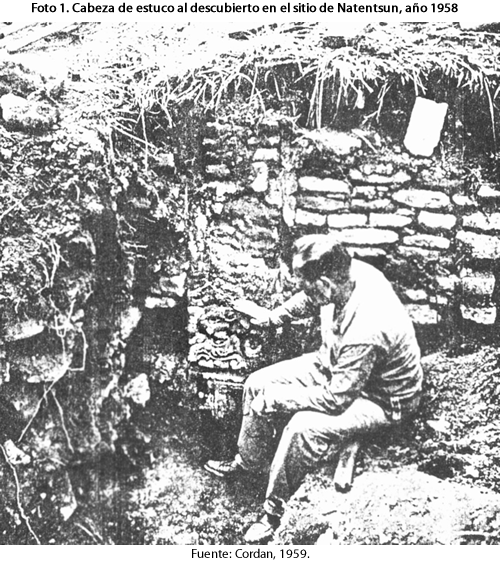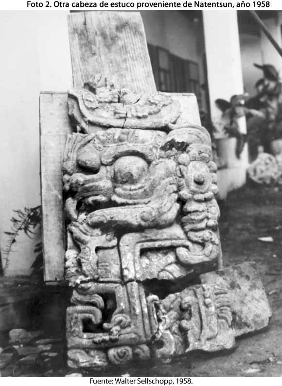 Las primeras noticias acerca de la existencia de Natentsun y de sus vecinos Chilón, Nachoj y Mukana las tuvo Wolfgang Cordan (1959). Advertido por un conocido suyo sobre el reciente descubrimiento y saqueo de estos sitios arqueológicos, Cordan decidió visitarlos en 1958. Los monumentos habían sido descubiertos durante los trabajos de trazo de las colindancias del poblado de Chilón (Adolfo Vera, comunicación personal, 2010). Todo parece indicar que fue el entonces dueño del terreno, Alfonso Jiménez, el primero que tuvo conocimiento de los restos arqueológicos y el que inició el saqueo. Cordan no tuvo éxito en encontrar la mencionada pintura del chivo que, según los lugareños, se conservaba en el interior de una de las estructuras de Natentsun pues fue destruida por saqueadores posteriores. Sin embargo, sobre uno de los muros de esta misma edificación descubrió la bella cabeza de un ser fantástico de estilo Clásico Tardío que, elaborada en estuco, parecía haber formado parte de un relieve mucho más grande recientemente destruido. Esta cabeza, que todavía se encontraba fijada al muro, afortunadamente fue fotografiada por Cordan al instante, pues más tarde sería destruida (Cordan, 1959) (ver foto 1). Ante la presión de Cordan, Jiménez accedió a mostrar otro fragmento de este relieve que él mismo había despegado y sustraído. Se trataba de otra hermosa escultura de estuco del mismo período que mostraba la cabeza de otro ser sobrenatural. Esta segunda pieza, junto con otras menores contemporáneas, también extraídas de Natentsun, se encontraba oculta justamente en la casa de Jiménez (Cordan, 1959: 70-113). Después de que Cordan fotografiara las piezas, todas ellas fueron retiradas de la casa de Jiménez y enviadas a Yajalón, en donde fueron de nuevo fotografiadas por Walter Sellschopp (ver foto 2) y (ver foto 3). Posteriormente, el señor José Óscar Moscoso, entonces recaudador de Hacienda Federal en Yajalón, las empacó para su envío al museo del Instituto Nacional de Antropología e Historia (INAH) en Tuxtla Gutiérrez, Chiapas (Augusto Sellschopp, comunicación personal 2010). Frans Blom y Gertrude Duby visitaron Natentsun poco después, en octubre de 1958. Duby todavía logró tomar fotografías de la cabeza de estuco fijada al muro antes de su destrucción (ver foto 4). Con estas fotografías, Blom y Duby elaboraron un reporte que fue enviado al INAH para su atención (Blom y Duby, 1958). Más tarde, Blom volvería a insistir en la necesidad de realizar investigaciones arqueológicas en el lugar (Blom, 1961: 118; 2004: 116). Para el año 1967, Natentsun por lo menos ya aparecía en el Atlas arqueológico de la República mexicana (Piña, 1967: 53). Sin embargo, los reclamos de Blom serían escuchados sólo varios años después por los arqueólogos Pierre Becquelin y Claude Baudez, de la Misión Arqueológica Francesa, quienes exploraron los tres sitios en 1977. Los arqueólogos franceses llevaron a cabo mediciones de todas las estructuras y elaboraron con ellas los croquis correspondientes. También rescataron diversos materiales arqueológicos, como restos de cerámica recolectados en superficie, y lograron datar con precisión los sitios en el Clásico Tardío. Todos estos resultados fueron publicados en su obra sobre Toniná, la cual incluyó un dibujo de la cabeza del muro de Natentsun, ilustración elaborada con base en las fotos de Duby, pues para cuando los estudiosos franceses trabajaron en el lugar ya había desaparecido esta obra de estuco (Becquelin y Baudez, 1982: 593-609, 1233-1239, 1242) (ver figura 1). Años más tarde, en respuesta a una denuncia local por saqueo presentada ante el INAH, el arqueólogo Alejandro Tovalín Ahumada visitó los sitios en abril de 1993 con el objeto de llevar a cabo un diagnóstico de estos. El especialista efectuó un reconocimiento que incluía mediciones de todas las estructuras, y atestiguó el grave deterioro con respecto al estado reportado por los franceses, por lo cual hizo la denuncia correspondiente (Tovalín, 1993: 1-2). Los datos incluidos en ese reporte se publican por vez primera en el presente artículo. Desde la visita del arqueólogo, las autoridades mexicanas no han llevado a cabo ni impulsado trabajos de investigación o rescate en el lugar. Afortunadamente, desde 1993 y hasta la fecha, el cronista de Chilón, el antropólogo Julio Alí Reyes Monterrosa, ha mantenido un constante seguimiento de estos sitios arqueológicos. En 1998, Reyes Monterrosa registró en fotografías el estado de conservación de las estructuras de Natentsun y de los otros sitios vecinos. También denunció ante distintas instancias el deterioro de los mismos (Reyes, 2009: 13-14). Por su parte, el geógrafo norteamericano Eric Samson, director del Proyecto Maya Esteem, realizó entre 1999 y 2007 varias visitas informales a Natentsun con el propósito de inspeccionar su estado y realizar estudios sobre el sitio, en las cuales evidenció nuevos pozos de saqueo (Samson, 1999-2007). En marzo de 2010, niños de comunidades vecinas a este grupo de sitios arqueológicos informaron a sus profesores sobre el descubrimiento de más estructuras en las cercanías, en esta ocasión, al parecer intactas. Es difícil ingresar al lugar pues éste actualmente se encuentra en territorios ejidales. Sin embargo, Reyes Monterrosa (comunicación personal, 2010) ha logrado acercarse y fotografiar las nuevas estructuras. Desgraciadamente, día tras día estos monumentos son dañados por los propios ejidatarios en su constante intento por encontrar supuestos tesoros en las entrañas de los edificios.