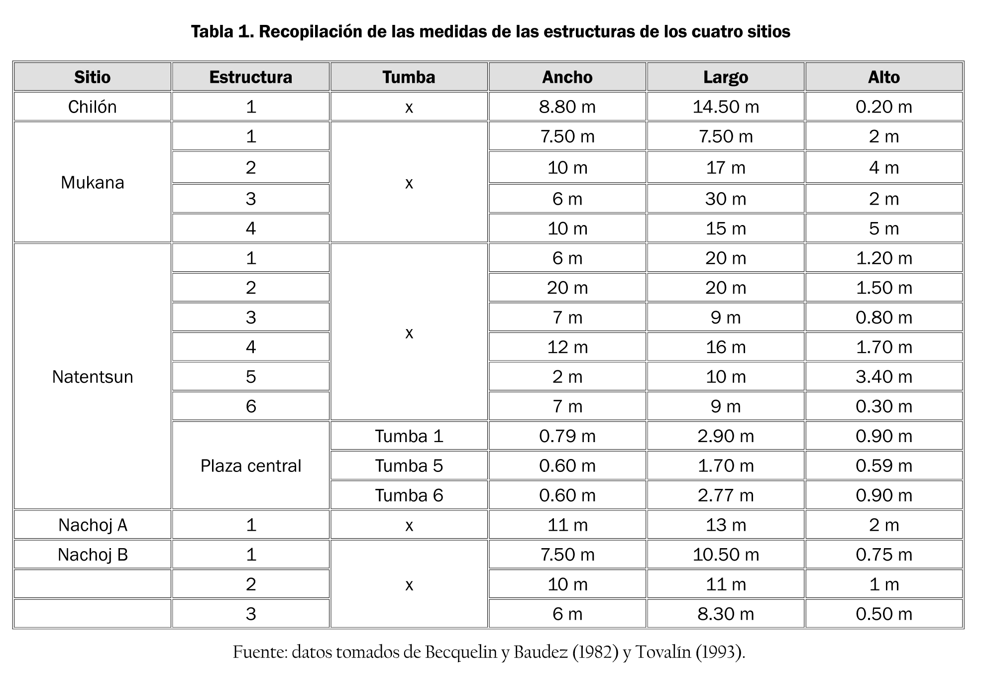 De acuerdo con lo registrado en la obra de Becquelin y Baudez (1982) y en el reporte inédito de Tovalín (1993), los cuatro sitios en cuestión presentan las siguientes características. El sitio de Chilón consiste sólo de una plataforma aislada sin cerámica de superficie. Mukana, por su parte, posee cuatro estructuras construidas sobre una meseta artificial alargada 90 por 25 metros; en dos de esas estructuras se hallaron cuatro posibles tumbas abovedadas. Por el lado sur presenta al menos dos terrazas a menor nivel. No se halló material cerámico de superficie. El sitio de Nachoj, a su vez, consta de una estructura separada, llamada Nachoj A, y de tres pequeños montículos de menos de un metro de altura, elaborados sobre una amplia terraza (50 por 20 metros), denominados Nachoj B. En ninguno de los dos se halló cerámica de superficie (Becquelin y Baudez, 1982: 593-609, 1233-1239; Tovalín, 1993: 1-2). Natentsun, por último, es un gran conjunto compuesto por seis estructuras de diferentes dimensiones y por una plaza central, todo levantado sobre la cima del cerro. En el borde norte de la plaza central se localizan seis tumbas abovedadas con nichos, todas ellas saqueadas. Cabe destacar que, al parecer, existía una tradición local de uso de criptas en terrazas, práctica que no se observa en otros sitios arqueológicos. En superficie se ha encontrado cerámica del período Posclásico Temprano (Becquelin y Baudez, 1982: 593- 609, 1233-1239; Tovalín, 1993: 1-2). Como se ha señalado, Natentsun es, de los tres sitios, el único que conservaba bellas figuras de estuco del periodo Clásico Tardío (ver foto 1 y figura 1), las que examinaremos más adelante. En coherencia con el espíritu del presente trabajo, y para poder valorar las dimensiones del complejo arqueológico en cuestión, en la tabla 1 se presentan las medidas de cada una de las estructuras y tumbas de los sitios de acuerdo con datos proporcionados por Becquelin y Baudez (1982) y Tovalín (1993).2