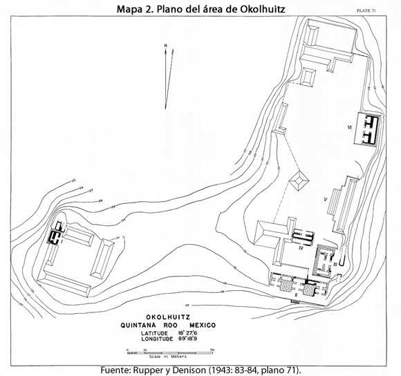 Los dos croquis con los que contaba el sitio hasta el momento eran los de Ruppert y Denison (1943: 83, plano 71 y figs. 103-104) y el de Benavides (1995), los cuales contemplaban el Okolhuitz conocido hasta entonces. Éstos fueron completados con el presente trabajo.
