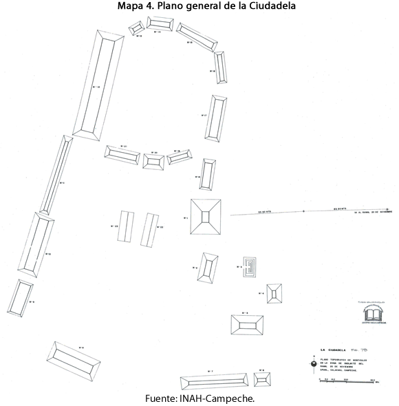 En segundo término, sucede lo mismo con el sitio denominado La Ciudadela, el cual se halla a un kilómetro de distancia de Okolhuitz. Entre estos conjuntos hay una constante: plataformas de baja altura, unidades habitacionales, edificios que se encuentran aislados, las canteras de extracción de piedra, ya sea para el núcleo del edificio o para la elaboración de los sillares de revestimiento, y se siguen presentando las albarradas que delimitan los solares familiares o las áreas de cultivo. Por ello podemos pensar que, debido a una gran densidad demográfica o por la disputa de tierras a nivel interno, se vieron en la necesidad de delimitar los espacios de las unidades familiares.