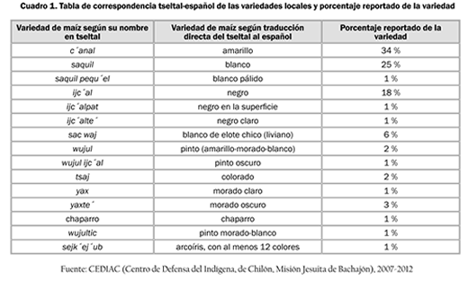 Como era de esperar, en toda la región se cultiva maíz y los productores siembran por lo menos dos variedades: una de menor rendimiento, de maduración temprana y resistente a las heladas, y otra de mayor rendimiento pero de maduración más lenta. No obstante, muchos productores tseltales siembran más de dos variedades de maíz y en muchas comunidades es común encontrar hasta 14. Una muestra de dicha diversidad, de la frecuencia de siembra y del cultivo en la región se presenta en el cuadro 1, que contiene una síntesis de investigaciones previas realizadas en la región de estudio en el marco de acompañamientos al equipo de facilitadores tseltales de las Unidades de Desarrollo Sustentable (DISO) y Medios de Sustentabilidad (MESUBYET) del Centro de Derechos Indígenas (CEDIAC) en Chilón (ver cuadro 1).