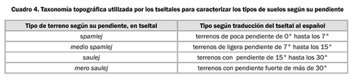 Al respecto, hay otro criterio muy sui generis que usan para distinguir los tipos de suelo, el cual está relacionado con el microclima del lugar. Así, un suelo puede ser también frío, sikil qu´inal, o caliente, kichin qu´inal, dependiendo de la altitud y de la cantidad de radiación que recibe del sol como consecuencia de la estación del año, lo que proporciona diferentes exposiciones solares por las sombras que se proyectan entre los cerros en las diferentes épocas. Lo anterior hace pensar que los tseltales reconocen y manejan un amplio registro de microclimas, producto de la topografía sumamente accidentada en la que habitan y de la interrelación con las vocaciones y aptitudes de cada tipo de suelo.