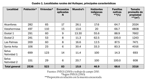 El trabajo de campo que sustenta esta investigación se realizó entre 2009 y 2010. Se realizaron 83 entrevistas estructuradas a pobladores de las localidades rurales del Huitepec, equivalentes al 15.8% del total de las viviendas y más del 10% de cada ranchería (cuadro 1). Los datos obtenidos incluyeron: a) información general de la unidad familiar integrantes, ocupaciones, origen, etnicidad; b) características de la propiedad y uso del suelo; c) fuentes de ingreso en la unidad familiar; d) en caso de haber producción agropecuaria, características de manejo, mercado y sus cambios en el tiempo. Además, se realizaron 17 entrevistas abiertas con informantes clave autoridades locales y pobladores antiguos y recientes para obtener información cualitativa de mayor profundidad sobre los cambios en la economía local, la agricultura y los actores sociales. También se realizaron recorridos de campo y observación participante en el Huitepec y algunos puntos de la ciudad.