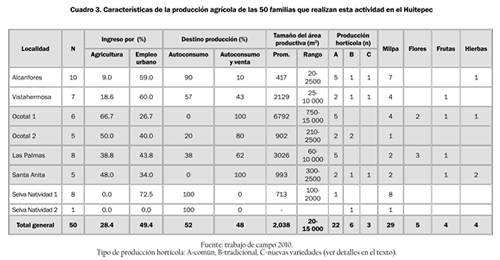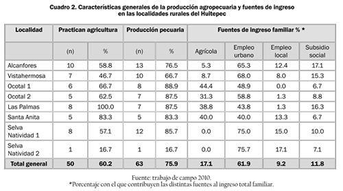 Las localidades rurales del Huitepec presentan diferentes características en su conformación étnica, origen o propiedad de la tierra, algunas de las cuales se indican en el cuadro 1. Sin embargo, en general en estas localidades la agricultura continúa siendo una actividad importante, sobre todo en términos culturales y de autoconsumo, ya que se realiza en más de la mitad de los hogares entrevistados (60.2%), aunque en términos económicos contribuye sólo con un 17% al ingreso familiar, con diferencias importantes entre las localidades (ver cuadro 2). Su relevancia económica es mayor en las localidades de Ocotal 1 y 2, Santa Anita y Las Palmas, que tienen población predominantemente nativa, con presencia indígena, disponen de terrenos de mayor tamaño y están más alejadas de la ciudad, donde la agricultura aporta entre el 30% y el 44% al ingreso familiar (ver cuadros 1 y 2). Por otra parte, en las localidades Alcanfores y Vistahermosa, que tienen una mayor presencia de habitantes de origen urbano, son cercanas a la ciudad y poseen mayores servicios, la agricultura aporta menos del 10%. En las localidades Selva Natividad 1 y 2, recientemente asentadas en el área y que disponen de terrenos pequeños, la agricultura tiene un aporte económico nulo.