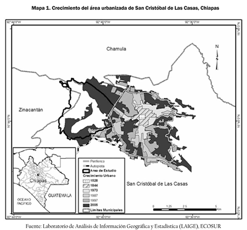 San Cristóbal de Las Casas es una ciudad media que tiene una población de casi 160 000 habitantes; se ha caracterizado por presentar un rápido crecimiento tanto de su población como de la superficie que ocupa (ver mapa 1), especialmente desde 1970, cuando apenas contaba con unos 26 000 habitantes (INEGI, 2010; CONAPO, 2005; García, 2005). Actualmente, San Cristóbal concentra el 85% de la población municipal, y el porcentaje restante se distribuye en 96 localidades rurales situadas a su alrededor. Al mismo tiempo, el municipio es el centro rector de la región Altos tsotsil- tseltal que incluye otros 16 municipios, principalmente de población indígena, los cuales presentan muy alto grado de marginación. Lo anterior implica una gran presión para la ciudad como referente regional en la búsqueda de oportunidades de desarrollo, y ha propiciado un crecimiento caótico e irregular a partir de flujos de inmigración regional que se ven acentuados en periodos de conflicto político o social, tales como las expulsiones religiosas de los años ochenta en los municipios vecinos, o la rebelión zapatista en 1994; ello ha ocasionado que gran parte del espacio urbanizado de la ciudad se haya ocupado por la vía ilegal (Velázquez, 2004). A este crecimiento por inmigración regional se ha sumado una gran cantidad de personas originarias de otros estados y del extranjero, que radican de manera permanente o temporal en esta ciudad de gran atractivo turístico.