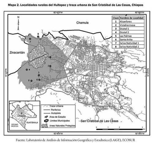Esta investigación se centró en un fragmento del espacio periurbano de San Cristóbal a fin de profundizar cualitativamente en las transformaciones locales que han ocurrido ante el crecimiento urbano. Una de las áreas boscosas y agrícolas más representativas de San Cristóbal es el cerro Huitepec, que alberga fragmentos de bosque mesófilo en su mayoría dentro de dos áreas naturales protegidas, situado a escasos seis kilómetros del centro de la ciudad. El trabajo se desarrolló en la ladera este del Huitepec, la cual está orientada a la ciudad, en un área de unas 1400 hectáreas donde están asentadas ocho localidades rurales que pertenecen administrativamente al municipio de San Cristóbal (ver mapa 2). De estas localidades, seis se segregaron entre 1970 y 2005 de una sola localidad antigua denominada El Huitepec, cuya presencia en la zona se remonta al menos a finales del siglo XIX hoy son las localidades Alcanfores, Vistahermosa, Ocotal 1, Ocotal 2, Las Palmas y Santa Anita; dos localidades más fueron fundadas después de 1980 por indígenas tsotsiles del vecino municipio de Chamula que salieron de su comunidad por motivos religiosos Selva Natividad 1 y 2 (Calderón et al., 2012). En las últimas décadas, la población de estas localidades se ha incrementado notablemente, sobre todo a partir del año 2000, pasando de 1500 habitantes ese año a 25364 en 2010, lo que representa un crecimiento del 6.8% anual (INEGI, 2010). Este crecimiento corresponde tanto al crecimiento natural de la población como a la llegada de pobladores urbanos a las localidades.