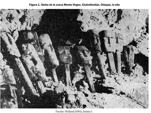 Un importante eslabón con el pasado se descubrió recientemente en el pináculo de una montaña en el municipio de Chalchihuitán, el más aislado. Se trata de una comunidad tzotzil 100% monolingüe, en Los Altos de Chiapas, localizada a unos 25 kilómetros de Larráinzar. En mayo de 1960, el Sr. Tugrul Uke, fotógrafo estadounidense ambulante que por esos días estaba viviendo en San Cristóbal de Las Casas, subió a la montaña denominada "Monte Virgen", situada en el rancho del Sr. Antonio Navarro. Él y su grupo, con la ayuda de guías indígenas, pudieron localizar una cueva poco profunda, ubicada cerca de la cima de la montaña y que contenía ídolos de madera. Aunque el Sr. Uke carece de preparación científica y de interés por el contenido cultural de los ídolos, tuvo buen cuidado de fotografiar las piezas in situ (lám. I [ver figura 1]) antes de saquear el lugar y repartirse el contenido entre él y sus compañeros.1