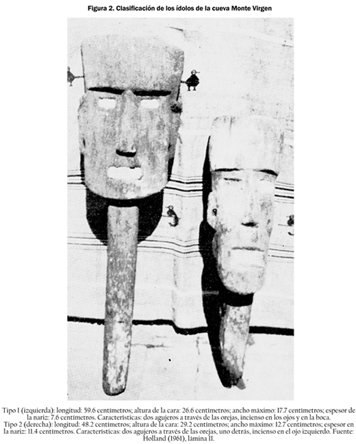 Como es costumbre en tan lamentables situaciones, no se recogieron datos etnográficos de ninguna clase, bien que otros informantes justificaron el alegato del Sr. Uke de que ese lugar había dejado de utilizarse para fines ceremoniales. Aunque el Sr. Uke afirma que había algunas piezas más, un examen cuidadoso de la fotografía revela un total de trece ídolos. El que esto escribe se inclina a creer que éste era su número exacto. Los ídolos eran de dos tipos (lám. II [ver figura 2]) y sin duda de origen post-hispánico, como lo prueban los cortes de madera de su manufactura.
