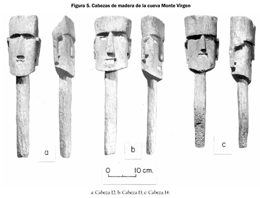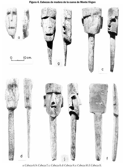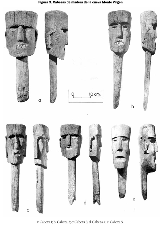 Desde el punto de vista etnológico pueden presentarse algunas consideraciones generales en torno a las piezas encontradas. Esculturas de este tipo se hallan en diversas partes del mundo "primitivo", y en la mayoría de los casos su presencia está asociada a cultos individuales. En principio no son máscaras, sino rostros rústicos sui generis, manufacturados a guisa de pequeños tótems, o quizás fetiches, que cuentan con una espiga o mango asa, ya para sujetarse con las manos o para fijarse en un lugar determinado. Este último parece que fue el propósito de los mangos que presentan las cabezas que estaban en Monte Virgen.