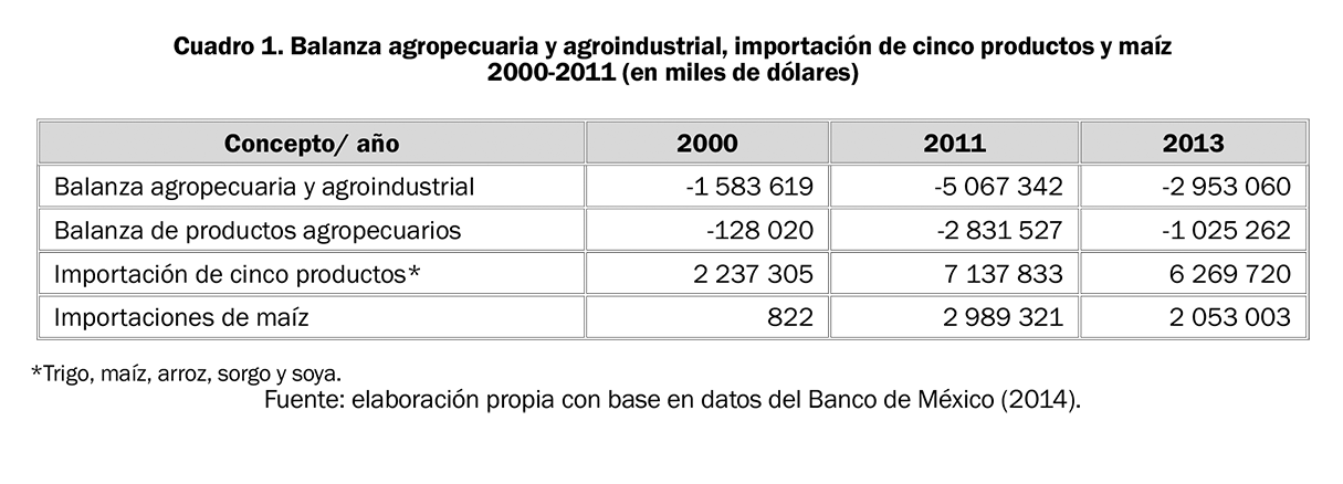 Como se puede observar en el cuadro 1, el déficit en la balanza agropecuaria y agroindustrial creció en la última década en un 220%; el déficit en la balanza de productos agropecuarios se incrementó en un 2111%; los cinco productos básicos más importados registraron un incremento del orden del 219%; y las importaciones de maíz, un 443.7%.