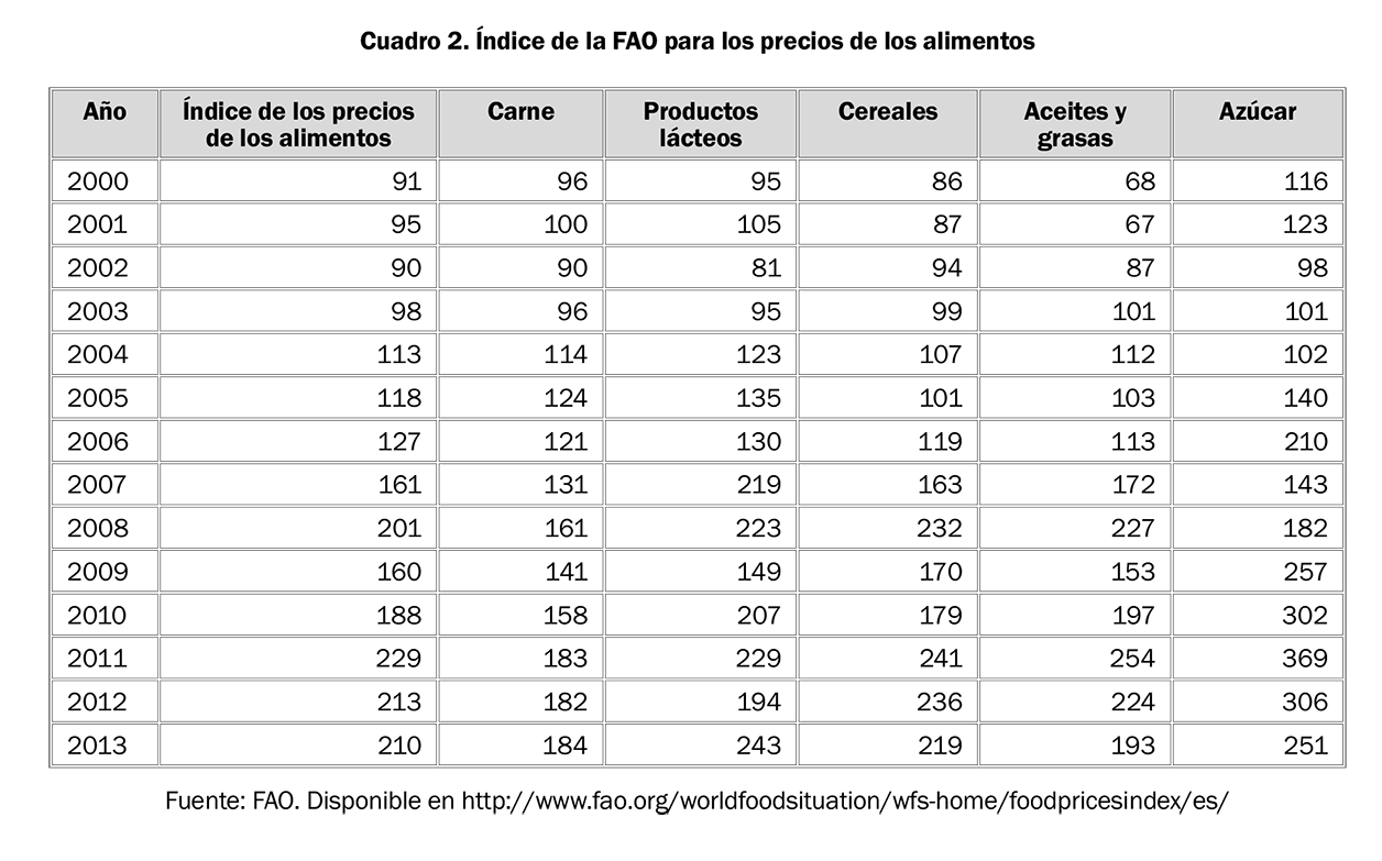 FAO (2014), "Índice de la FAO para los precios de los alimentos". S.l., FAO. Disponible en http://www. fao.org/worldfoodsituation/foodpricesindex/es/ [consultado el 8 de abril de 2014].