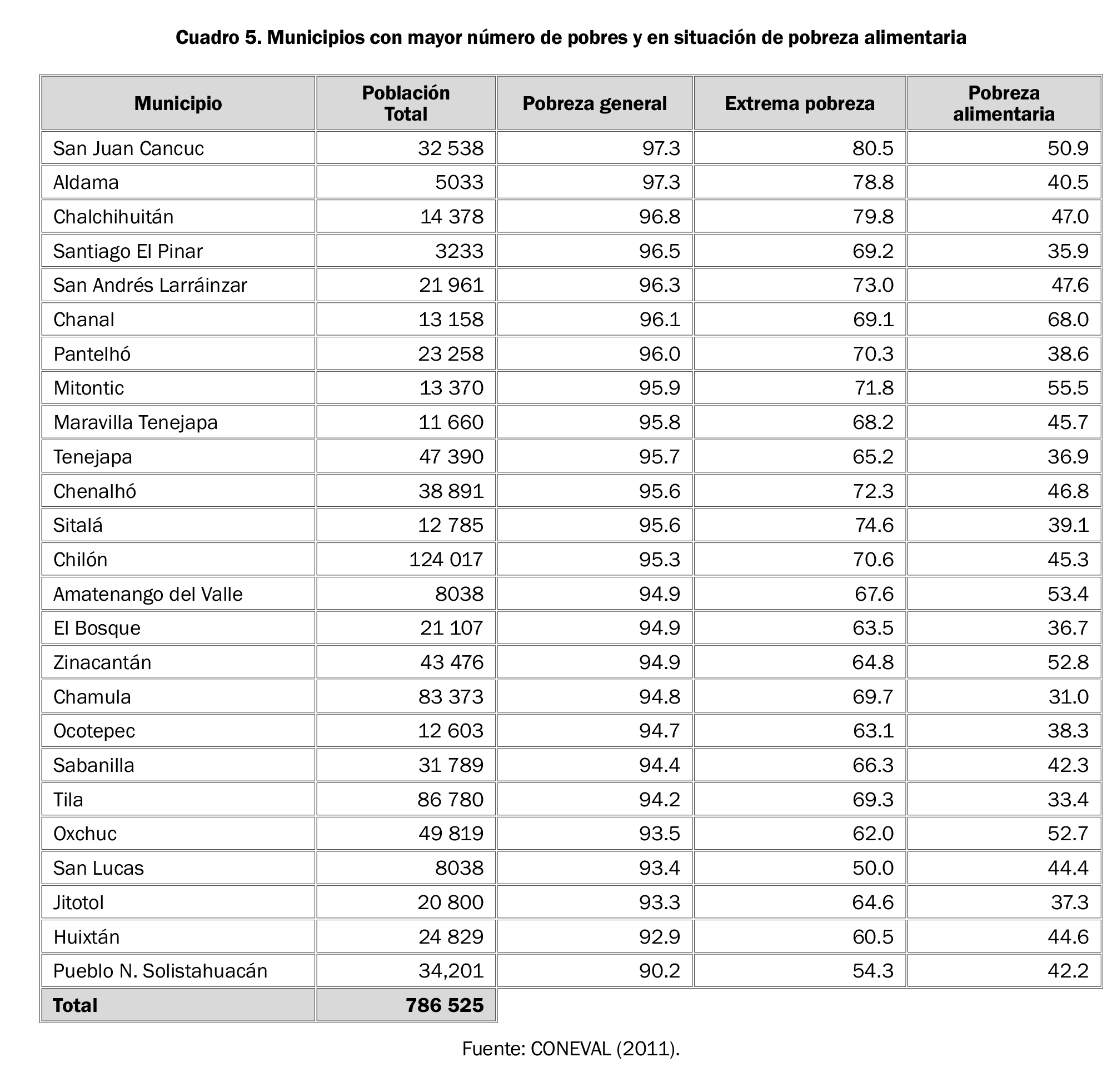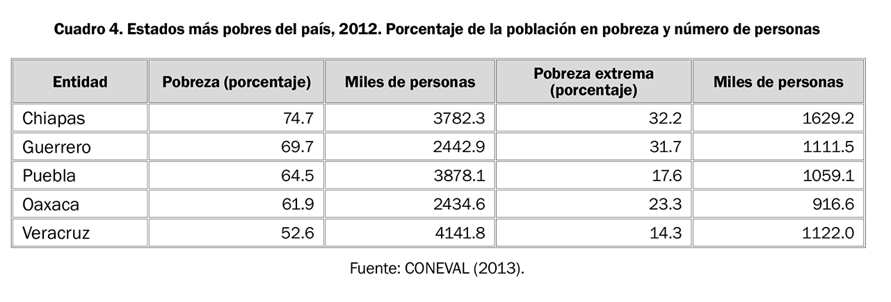El proceso anterior ha venido acompañado por el crecimiento de la pobreza y de la nueva pobreza, sobre todo en el campo. Según los datos más recientes del CONEVAL (2013), que corresponden al año 2012, Chiapas sigue siendo el estado con el mayor número de pobres de todas las entidades federativas del país: cerca del 75% de su población vive en condiciones de pobreza. Supera a Oaxaca en casi 13 puntos porcentuales, a Puebla en 9.2 y a Guerrero en 5. Chiapas tiene alrededor de 1.3 millones más de pobres que Guerrero y Oaxaca. Los cinco estados del sur presentados en el cuadro 4 cuentan con el 31.2% de los pobres del país y con el 50.6% de los pobres extremos.