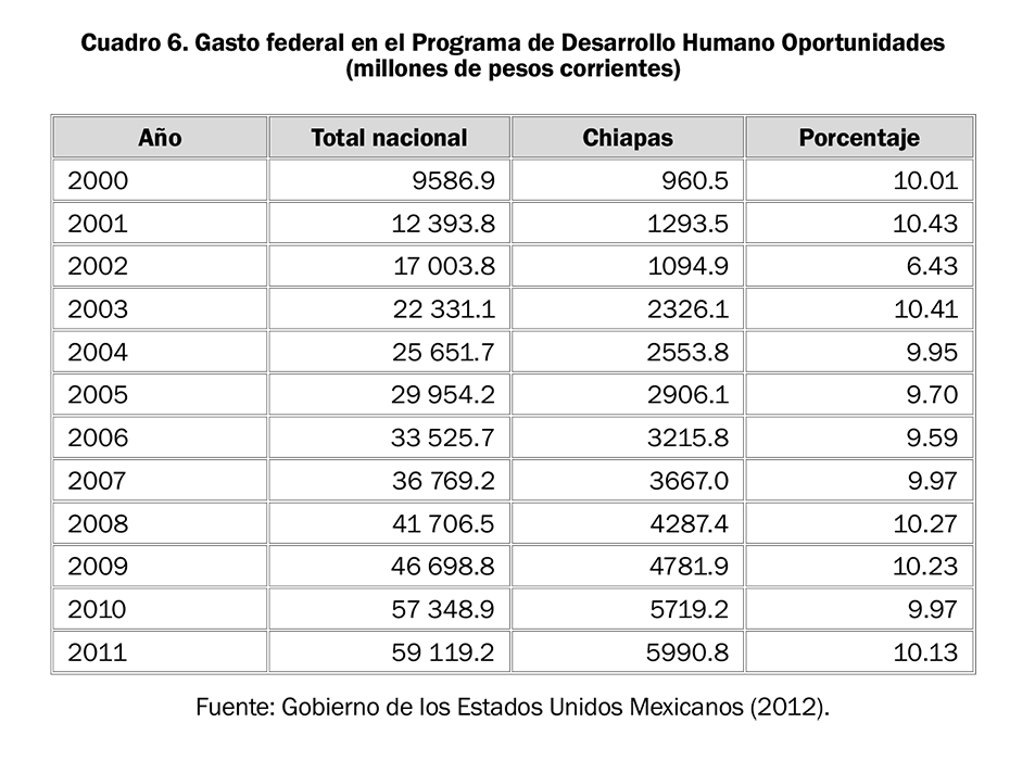 Chiapas ocupa un lugar importante en el presupuesto asignado al combate a la pobreza, cuya proporción del gasto nacional fue de un promedio muy cercano al 10% durante el período 2000-2011. De hecho, la entidad es la segunda en importancia, después de Veracruz, por el monto de los recursos otorgados por Oportunidades. El tercer lugar lo ocupa Puebla, sigue en cuarto lugar el Estado de México, Oaxaca en quinto y Guerrero en sexto lugar. Los seis estados concentraron en 2011 el 49.73% del total de recursos, con 29 402.9 millones de pesos, lo que una vez más constata que el sur de México es el territorio donde se concentra la mayor cantidad de pobres y excluidos del país, y sin embargo, paradójicamente, es donde existen vastas riquezas en recursos naturales.
