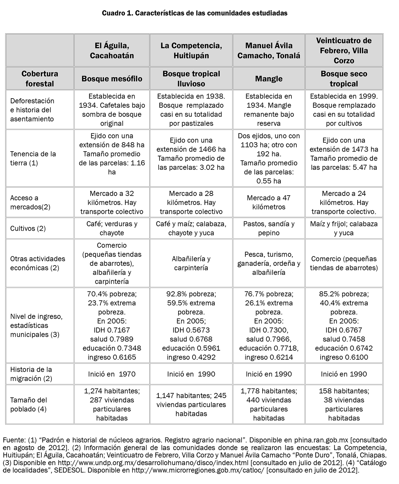 La Competencia: esta comunidad del municipio de Huitiupán está situada a 420 metros sobre el nivel del mar y goza de un clima cálido húmedo con lluvias en verano. La migración inició en La Competencia después de la caída de los precios del café en 2001. De las 102 familias encuestadas en esta comunidad, el 48% tiene o ha tenido migrantes en Estados Unidos, y el 34% recibe remesas. Muchos han migrado a Oklahoma para trabajar en una cantera. La mayoría de las familias (83%) son propietarias de tierra agrícola. El tamaño de las parcelas varía de 75 a 18 500 metros cuadrados. El 47,6% de las