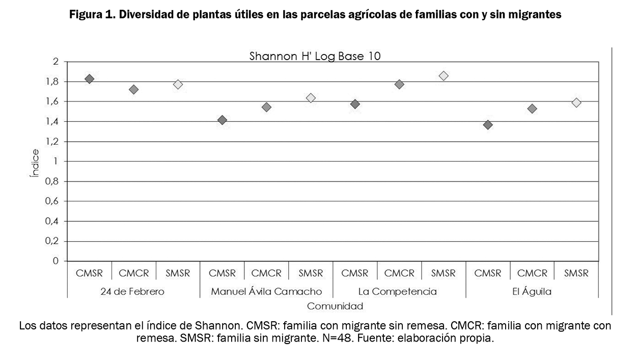 Los datos tomados en las parcelas de algunos de los encuestados, relacionados con la diversidad de plantas útiles, sugerían también que no había diferencia significativa entre familias con y sin migrantes (ver figura 1), aunque parece que había una tendencia consistente en la mayoría de las comunidades estudiadas a que las familias con migrantes que no recibían remesas cultivaran menor diversidad de plantas en sus parcelas.