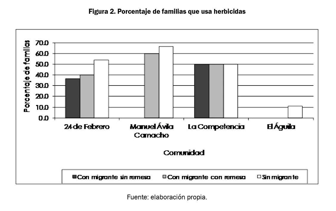 Plaguicidas: En cuanto al uso de agroquímicos en general herbicidas, insecticidas o fertilizantes, la mayoría de las familias encuestadas dijo que los utilizaba, y su uso no parecía estar relacionado con la migración. Sin embargo, en el caso de los insecticidas, en Manuel Ávila Camacho y en La Competencia sí utilizaban insecticidas más familias con migrantes que recibían remesas, que aquellas que no tenían migrantes o no recibían remesas. En el caso de los herbicidas, un alto porcentaje de las familias encuestadas los utilizaba para el manejo de malezas, con excepción de las residentes en El Águila, donde principalmente se produce café orgánico. En contra de lo esperado, se observó que, en general, usaban herbicidas más familias sin migrantes que aquellas que sí los tenían (ver figura 2). Ninguna familia manifestó haber adoptado prácticas agrícolas aprendidas en Estados Unidos en sus parcelas ni haber traído semillas.
