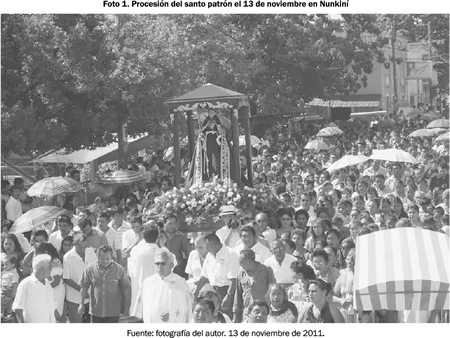 Así, durante las fiestas patronales no resulta extraño escuchar a los hombres contarles a sus hijos, sobrinos y nietos cómo mucho tiempo antes de que ellos nacieran, la prodigiosa actuación de san Diego salvó a los antiguos moradores de Nunkiní de perecer en una devastadora epidemia de viruela negra que asoló el poblado y a punto estuvo de hacerlo desaparecer. Habitual resulta igualmente ver a los socios varones de alguno de los gremios que se encargan de desfilar durante las fiestas patronales conversar, mientras trabajan en los preparativos propios de la celebración, sobre la ocasión en que el sagrado patrón del pueblo logró acabar con una plaga de langostas que había ya consumido las milpas de las vecinas poblaciones de Halachó y Bécal.22 Aunque más reciente en el tiempo, es también recurrente escuchar el relato sobre la vez en que san Diego ayudó a sofocar un incendio que se desató una noche en el "ruedo" que cada año los hombres de Nunkiní construyen en la plaza de la población, con maderas y palmas, con motivo de las celebraciones patronales del mes de abril. La intervención del santo resultó providencial para evitar que las llamas saltaran y se propagaran por el guano seco que cubría y todavía cubre un buen número de viviendas.