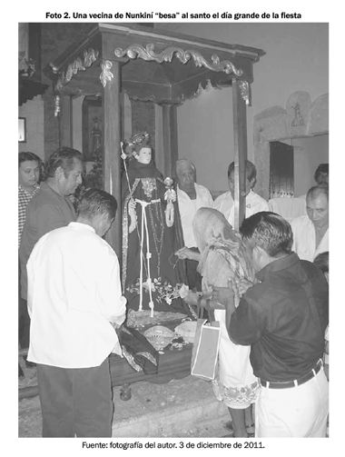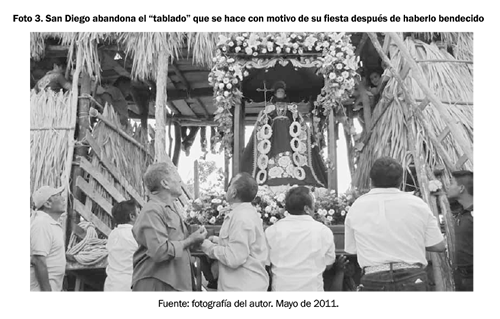 Una muestra de lo que vengo mencionando hasta aquí la hallamos en la creencia generalizada de la que hacen gala los habitantes de Nunkiní, en que la imagen de san Diego que se encuentra en la población no es una mera representación iconográfica de un personaje histórico del siglo XIV, sino que ante sus ojos resulta ser la personificación misma de una entidad sagrada.12 O lo que es lo mismo: la talla de madera que durante todo el año se resguarda en el nicho central de la iglesia de la comunidad atesora poderes sobrehumanos; y por ende, resulta milagrosa y sagrada en sí misma, de lo que ha dado sobradas pruebas a lo largo de la historia. Este carácter sagrado que atesora la imagen la ubica en un ámbito diferenciado del mundo ordinario y la reviste "de una carga o potencia de la que carecen otros aspectos de la realidad" (Bartolomé, 2006: 99).